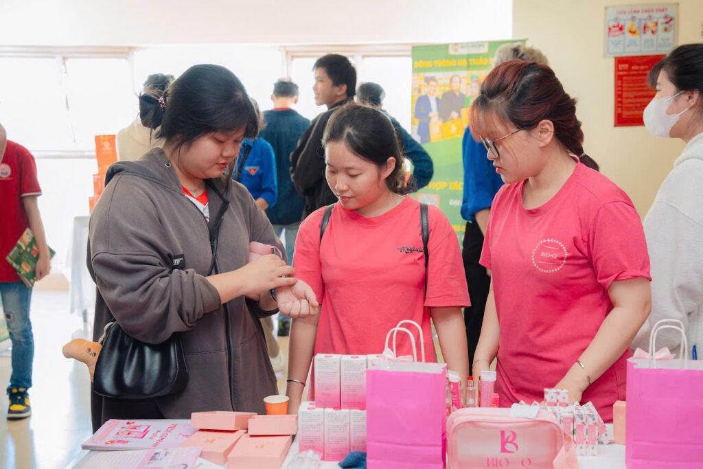 Ngay từ khi bắt đầu, gian hàng Bio-Q tại trường Cao đẳng Kỹ Nghệ II đã gây ấn tượng bằng thiết kế màu hồng gần gũi với mọi người. Tại đây, các bạn sinh viên đã có cơ hội trực tiếp trải nghiệm những sản phẩm chăm sóc da được chiết xuất từ vỏ thanh long – điểm nhấn độc quyền làm nên tên tuổi của Bio-Q.